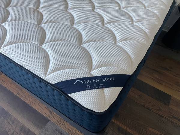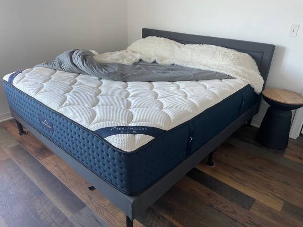 Dreamcloud King Mattress with frame, very nice condition, no tears or stains. Only slept in around 10 times with family visits. Always had mattress cover/protector on. Very comfortable, medium to firm, have several King sheets can include with sale. Will need 2 strong people as it’s heavy and bulky, weighs around 150 lbs. OBO