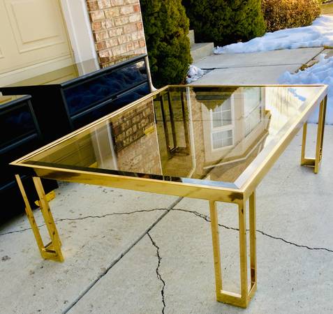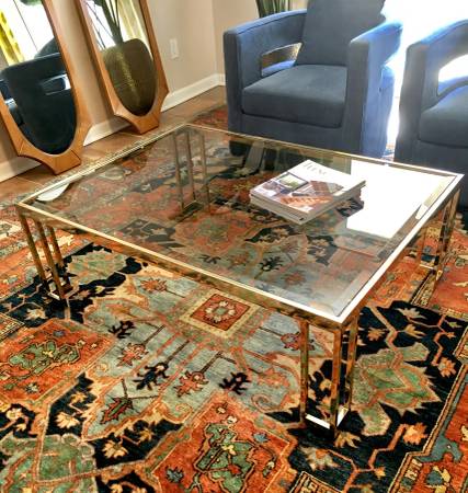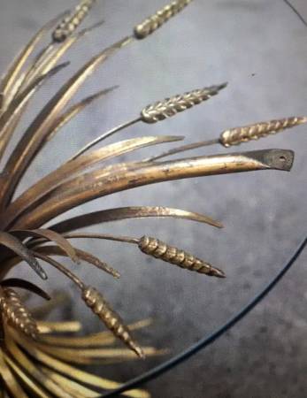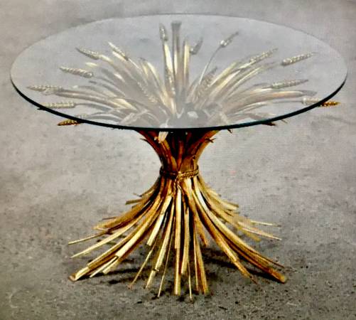 First picture is an exquisite S. SALVATORI designer table. These tables were inspired by Coco Chanel, in the 50’s 60’s. This table can be used as a coffee table or on the side as accent and will give a sophisticate and unique look to your decor. It’s been for sale online for over $3000. Very interesting look and a rare collectible piece. Wear consistent with age and use. This table is in nice vintage condition. It does have chips to the gilt finish and some oxidation which adds to the vintage charm appeal. The 3/4" thick glass top have no chips-few fleabites to the edges, there are also a few light scratches.