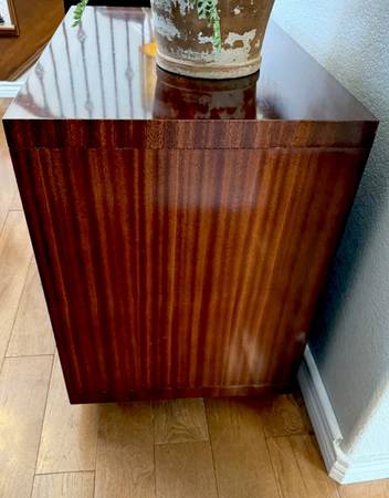 These oversized (30” wide) side tables are signed by John Widdicomb and were made with burl type wood and high polished veneer in a fantastic quality workmanship. This set has been lightly restored, and is in very good condition. A John Widdicomb pair of night stands is very rare and this one is truly striking. The price for night stands sets like this go up to $10k online. Delivery is possible to be arranged.