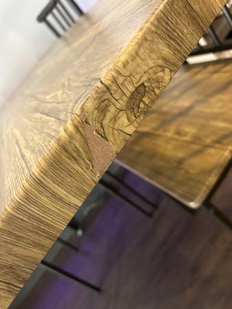 Amazon wooden table. 4 chairs in great condition and so is the table besides where the wrapping is slightly peeling around the outside (pictured). You will have to carry this down the stairs of my apartment but it is light. The legs can be removed from the table and the chairs but I do not have any tools.