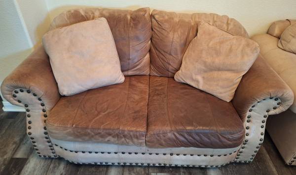 Well-used couch sofa set. Includes love seat, couch, and ottoman. Tan/Brown color. Note that there is some doscolation. Pickup in Aurora near Quincy and Picadilly.