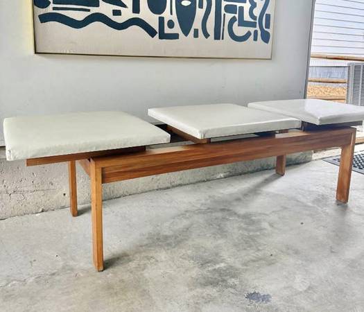 This bench is made from wood, possibly teak (or walnut?), and features white vinyl upholstered cushions that can be easily re- unsheltered unto a cool fabric of your choice. It’s a versatile piece that can even be used occasionally as ottoman.