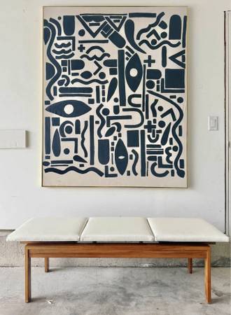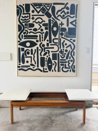 Sold - This minimalist bench is a Mid-Century Modern piece, designed by JOHN KEAL. It’s often referred to as a coffee table bench or slat bench. It features a slatted wooden base and can be configured in different ways, 3 or 2 sections, which can be interchanged. So, it can be used as a two seats by removing the center cushion at 44 inches or with the 3 seats wooden/fabric cushions expanded from 54” to maximum of 58/60”.