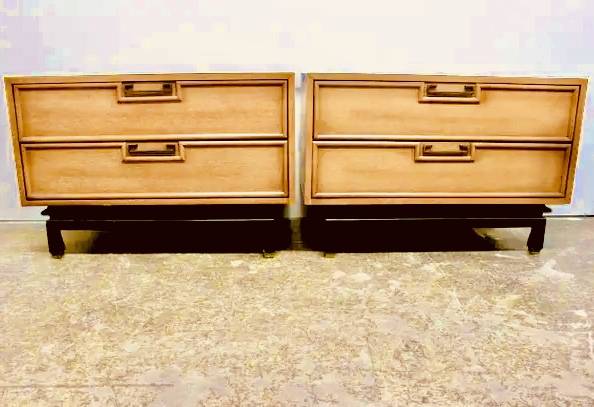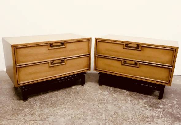 Pair of American of Martinsville nightstands with black lacquered base. Marked with the "American of Martinsville" logo on inside drawer. In excellent condition. Dimensions: 36" x 19" x 24".