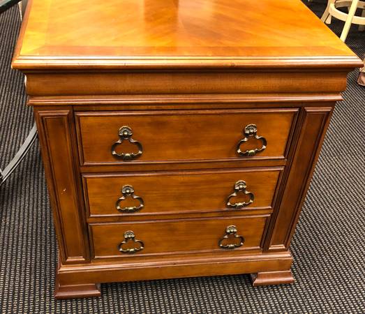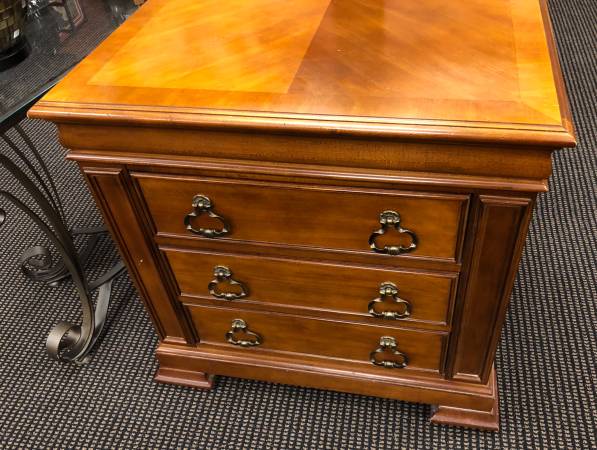 This set of high end quality night stands by Henredon has just such an elegant look, with two tone mahogany accents. These night stands are tall enough to reach by your bed. They will go well in a more classic or mid century type of decor. In excellent condition, no scratches or stains. Online they cost in a range of $995 each and over.
