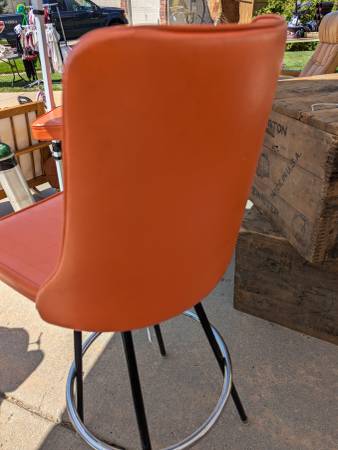 Orange vinyl and black steel swivel bar stools. Great condition, set of 2.
