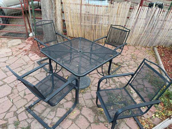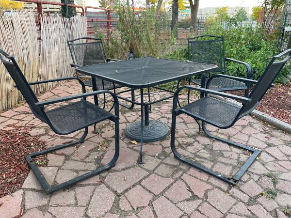 Table, 4 chairs, and umbrella stand. Heavy metal. Good as is or would be cute spray painted too 120$ cash