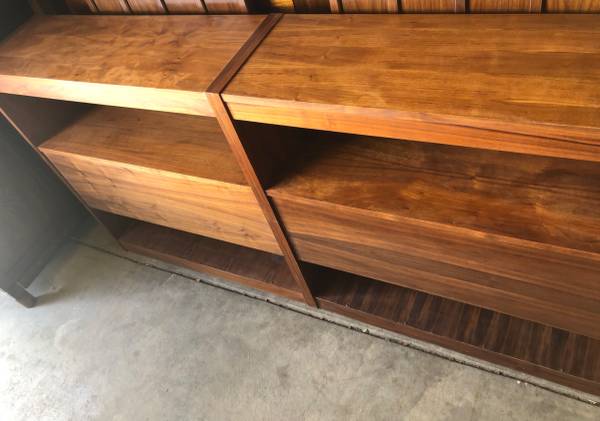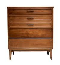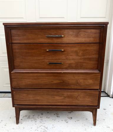 Fabulous genuine mid century dresser and mirror set with great features and details. This dresser has a warm dark walnut color wood with beautiful pattern. The whole set has been restored after pictures. Drawers open smoothly, and no major scratches.