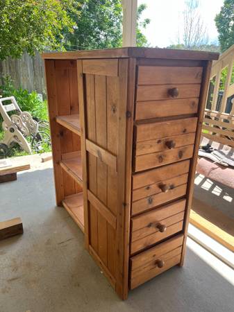Wooden bunk bed set with 2 twin size beds, desk, chair, bookshelves with built in dresser. No mattresses included, you don't want them anyway. The last posted picture just show you the similar set, it isn't the selling one please check out the pictures.