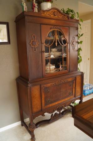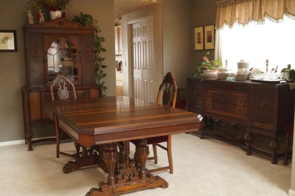 9 piece Early American walnut dining suite, circa 1925, in very good condition. Rectangular 6' extension table, Mediterranean style with "cut corners"; double pedestal type with stretcher below; set of 6 dining chairs (2 armchairs); upholstered pop-out seats. Gorgeous matching china cabinet; ornate fret-work over glazed single door. Matching 6' buffet, 5 drawer, 2 end storage cabinets.