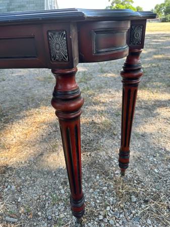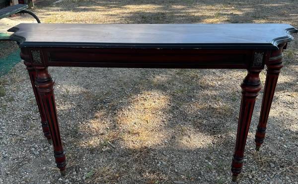 Nice cherry wood table with scrolling and detail. No drawers. 14.6” x 55” long x 29.6” h. $45 cash
