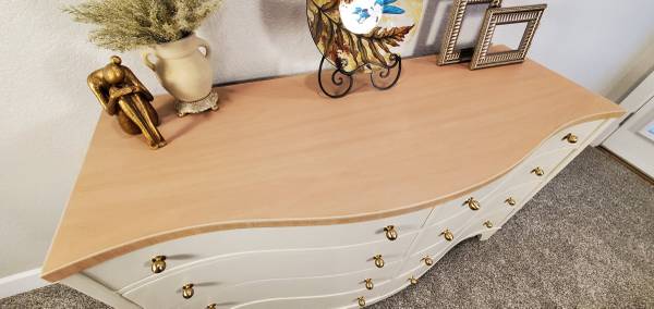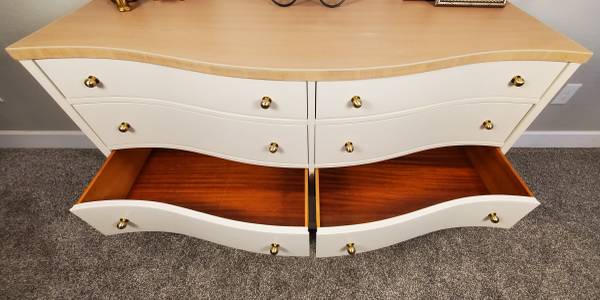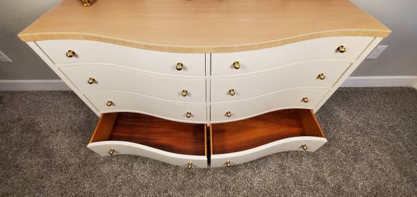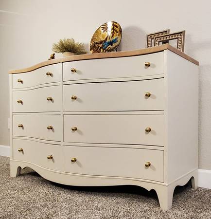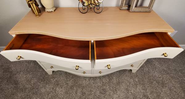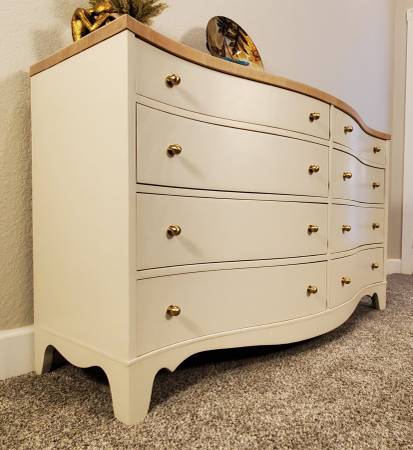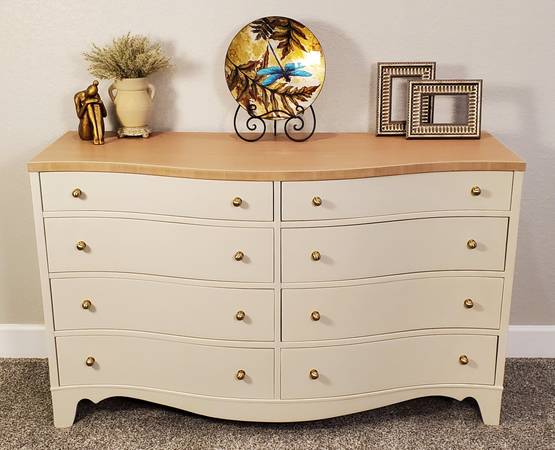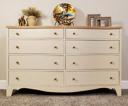 The entire dresser has been completely stripped. It has been refinished in a high quality Sherwin Williams Urethane Enamel Alycalid paint in the color Accessible Beige; a warm neutral with gray undertones that will compliment any décor.