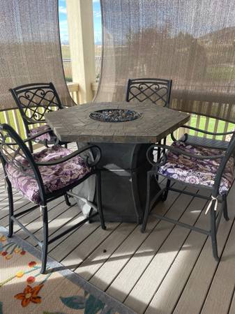 Outdoor bar height fire pit table and 4 chairs with new cushions. Table and chairs are bar height.