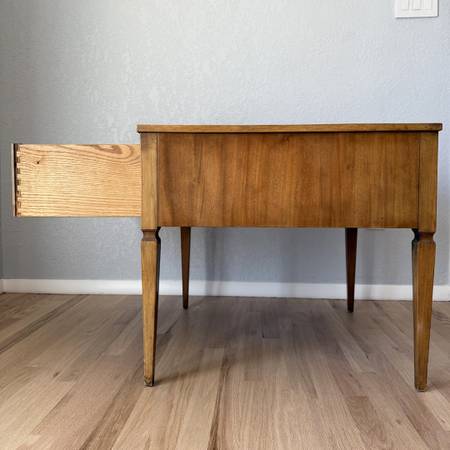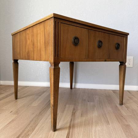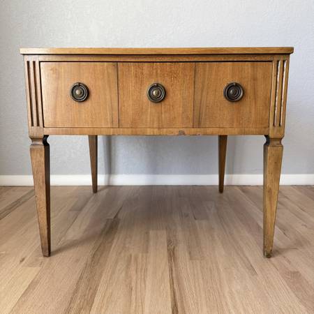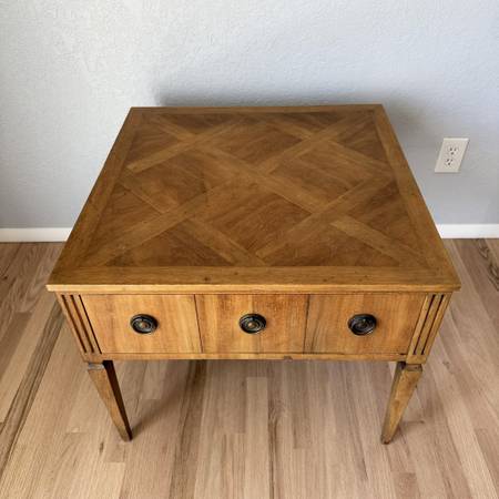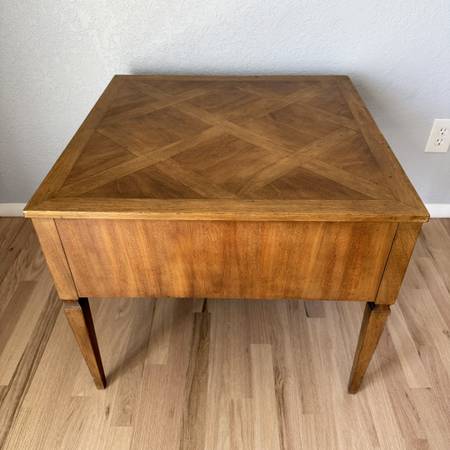 1960s Vintage Side Table - rare and excellent condition! This mid century modern end table was hand constructed in the 1960s using honey Oak hardwood. Its best feature is the Kittinger Square parquetry top surface, which is made by arranging small pieces of wood with alternating grain in a geometric design. It has a single drawer with adjustable compartments, accented by an antique manufacturer's logo burned into the wood. The exterior features fluted detailing, tapered legs, and original brass knob pulls. If you love retro furniture, this is prettier and more durable than modern-day Chinese knockoffs sold at West Elm, Pottery Barn and Restoration Hardware. Comes from a pet and smoke free home. Measures 27ʺ wide by 27ʺ long by 22.5ʺ tall.