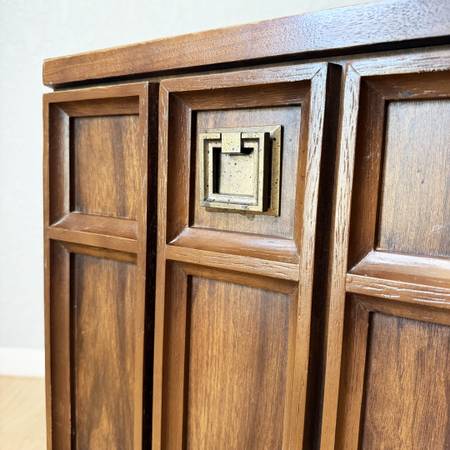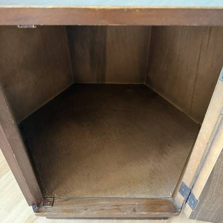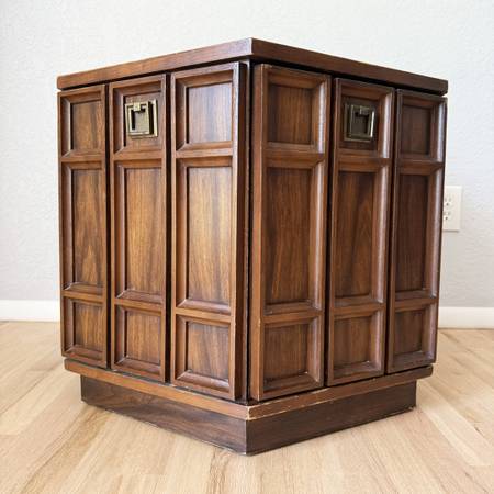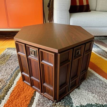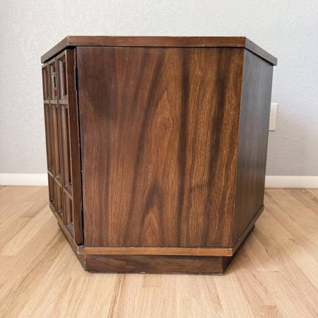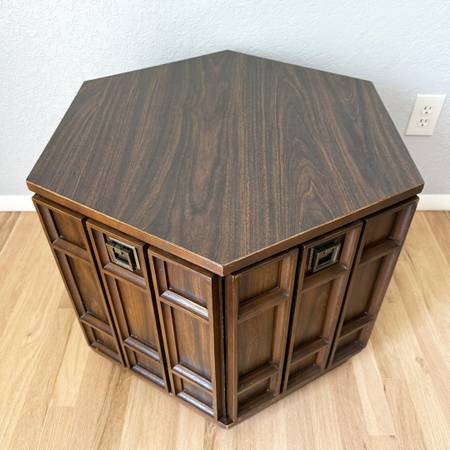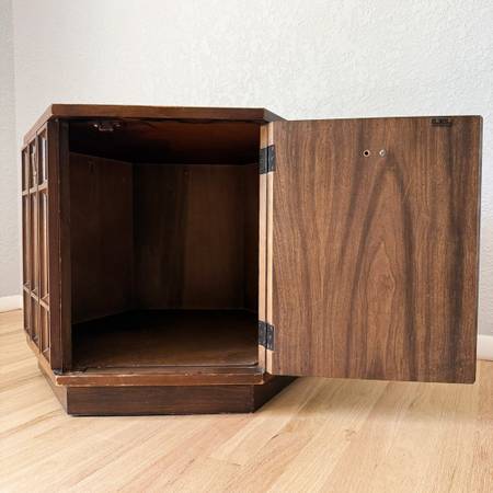 Vintage Hexagon Wood Table Cabinet - beautiful! This 1970s mid century modern side table cabinet is made of wood with a walnut finish. It has a hexagonal top and base, with two of the six sides featuring decorative geometric paneling and funky square brass pull handles. When one door is opened, it reveals a deep hollow interior that's great for storage. This one of a kind, handcrafted antique is in amazing condition and so much more interesting than the cheap, Chinese knockoffs sold at West Elm and Restoration Hardware. Comes from a pet and smoke free home. Measures 28” wide by 24” deep by 21.5” tall.