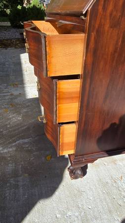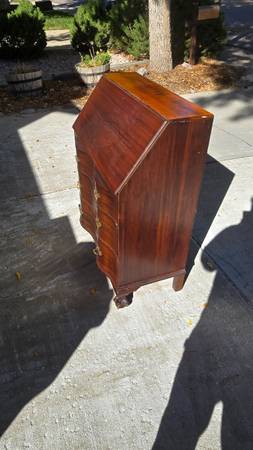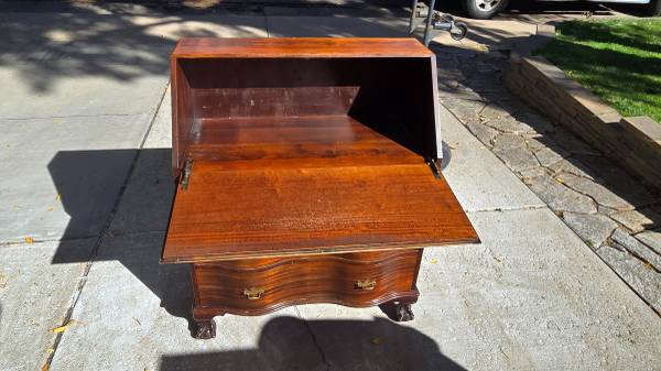 Classic slant style drop front desk likely made of mahogany. Dings and scratches on claw feet, solid build and in good condition. Desk is complete with several small cubbies and drawers for organization. Dovetail drawers. The front has a wonderful curved shape. Plenty of storage space and perfect as an entry was table, or a spot to write out some notes to friends! Includes wooden chair mat.