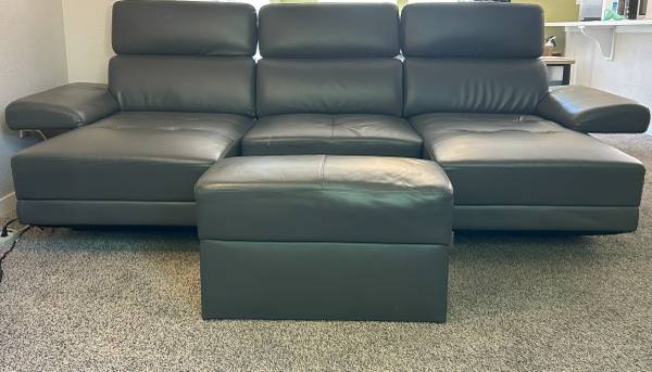 The ends of this couch rotate so that you can have a standard couch in your living room, or THE 2nd position rotates to support your feet as shown in the pictures. There are 3 sections that attach. And the ottoman has space for storage inside.