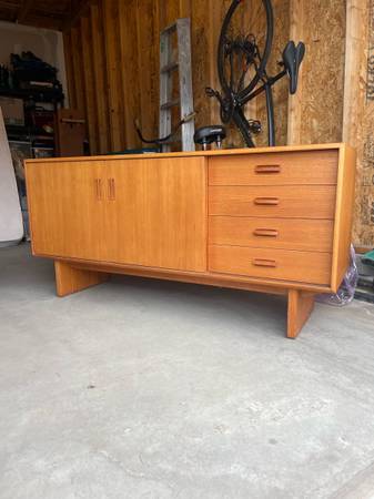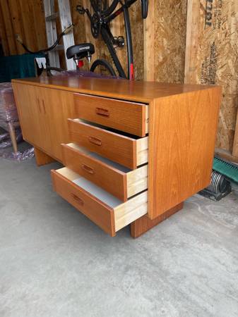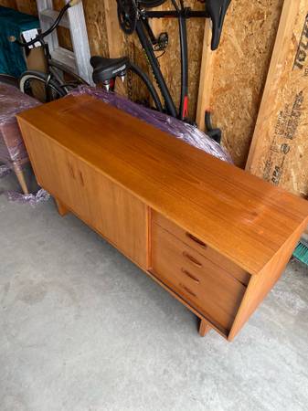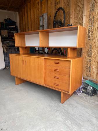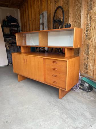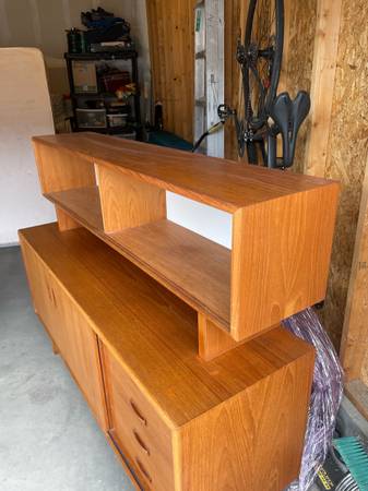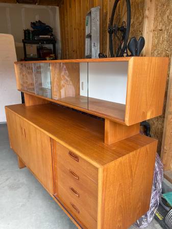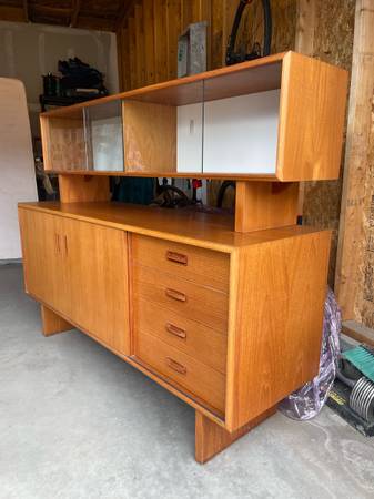 Two piece Teak Credenza / Hutch - absolutely gorgeous and in amazing condition . Single owner . Glass sliding doors on top cabinet . Sliding doors on bottom credenza can move all the way across. $2750