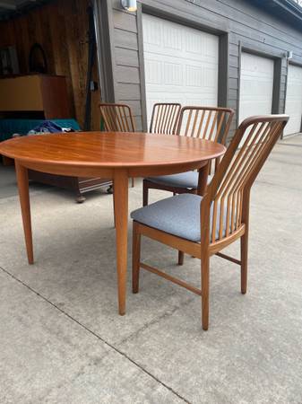 Teak Dining table + chair set , made in Denmark - round dining table that comes with an additional TWO leaves and original table covers so can expand to a large oval . 4 dining chairs . Excellent condition . $2000