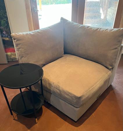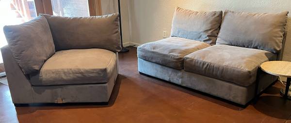 High-end Jonathan Louis “Ryder” Collection modular sofa in Parallel Dove Grey fabric. Includes 1 armless apartment sofa + 1 corner wedge, joined together to create a generous 106” wide sofa.