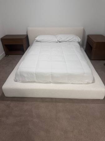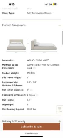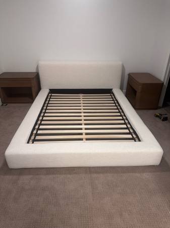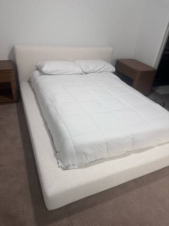 Brand new Castlery Dawson Low Profile Queen Bed frame only (Mattress Not Included). The dimensions are 76.4" Wide x 98.4" Deep and 35" High. There is a picture that has the total dimensions from the...