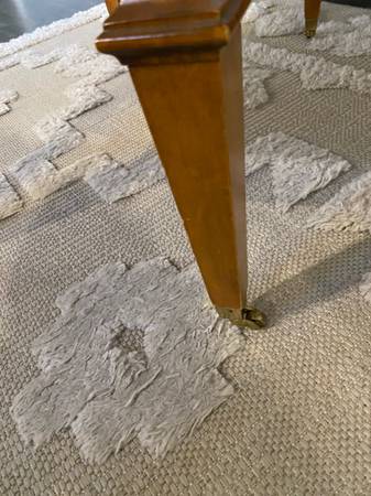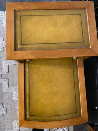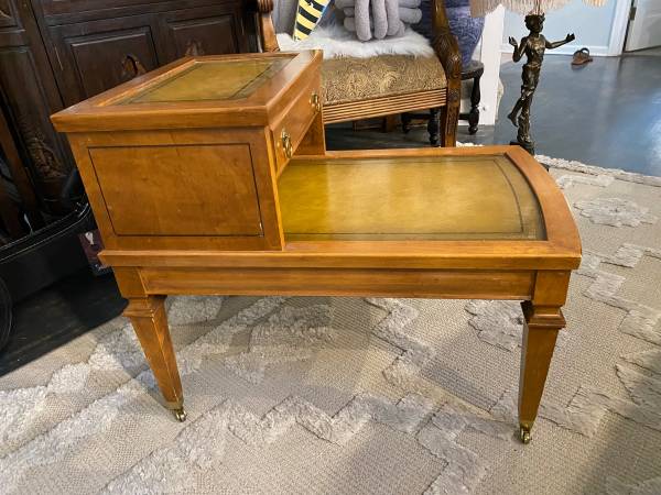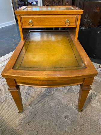 Vintage MCM Mid Century Modern Mersman Side Table. Made with Yew Wood and features leather inserts on both tiers. Narrow spindle legs with metal casters for feet. Two tier style with drawer and...