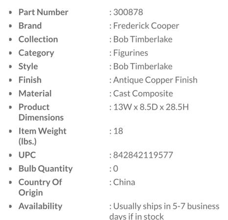 Elegant designer piece by Bob Timberlake for Wildwood – perfect for farmhouse, rustic, or traditional décor. Dimensions: 28.5”H × 13”W × 8.5”D Material: Cast composite Finish: Antique Copper Weight:...