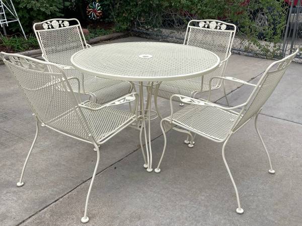 TABLE W— 42” H— 29” 4 — WROUGHT IRON CHAIRS EXCELLENT CONDITION COLOR : GLOSS ALMOND BEAUTIFUL SET HOLE IN TABLE TO ACCOMMODATE A UMBRELLA. HEAVY IT WILL NOT BLOW OVER NO RUST AT ALL ROSE PATTERN...