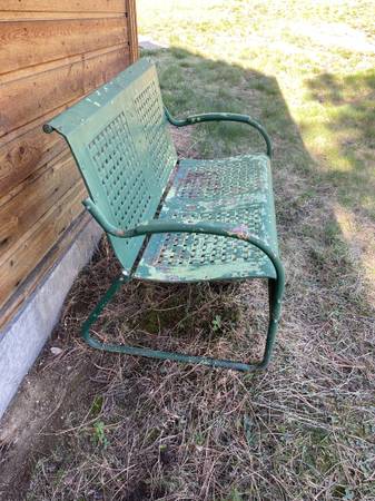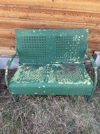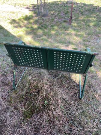 Antique green metal bench with basket weave back. Paint is coming off but you still can use without refurbishing it. Classic look with the basket weave on the back and seats. Cash only.