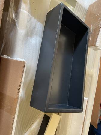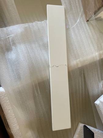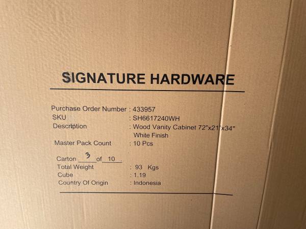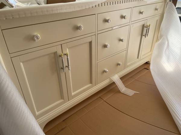 72" Claudia Double Vanity without countertop. Constructed of solid mahogany with a white finish. Brushed nickel hardware. Three standard drawers, two sets of doors, and two additional tilt-out drawers with soft-closing hardware for smooth and quiet everyday use. One drawer divider was broken, but we glued it back together. Two drawer dividers were painted black, while we were trying to decide on a solution to this vanity not being the color needed for our bathroom remodel (as shown in pictures). Otherwise, brand new, not used, and no visible damage to the cabinet or drawers. Must be able to haul away; will not deliver.