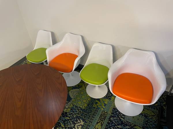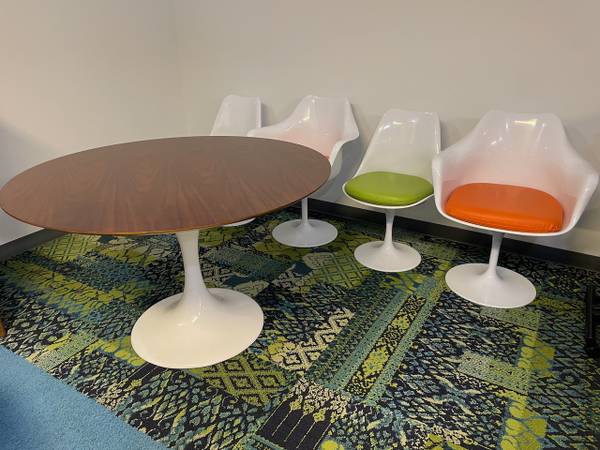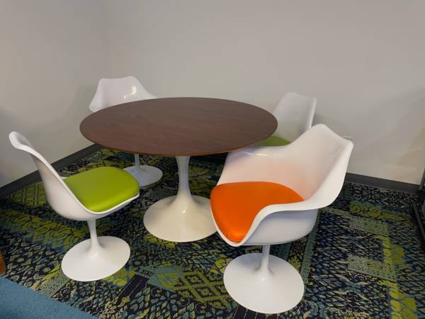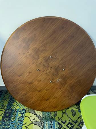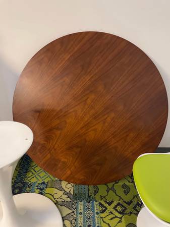 Mid Century Modern style and goodness. See pictures WYSIWYG. 48" Walnut laminate top. 4 chairs. Reproduction. We paid $1800 for the set, asking $900. The base has some hard to see hairline cracks in...