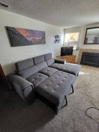 Great condition 8ft couch with pull out section. Color is Grey, nice stitching. 8ft wide, 36" deep at the one side and 65" deep on the other side. Has a pull out that turns it in to one big area. $100 cash, zelle or venmo. Email or chat if interested