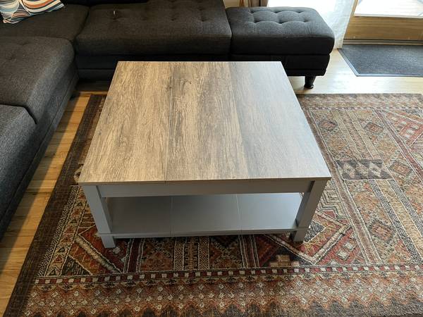 This coffee table completes your living room with a classic look and extra storage. It's crafted from wood with a solid smooth finish on the base and a light Sonoma oak hue on top. The square design features two tiers with plenty of room – the top is great for flowers, drinks, and board games, and the bottom is just right for storage baskets for tucking away the remote control or phone chargers. This coffee table measures 3' wide and deep, so it's the ideal size for most standard sofas.
