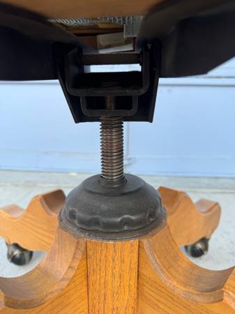 A classic Windsor-style, spindle back, leather upholstered seat. Riverside Furniture, Ft. Smith, AK. Barrel-back Banker’s Swivel Chair. Constructed from solid oak and sits on a rolling, 4-legged...