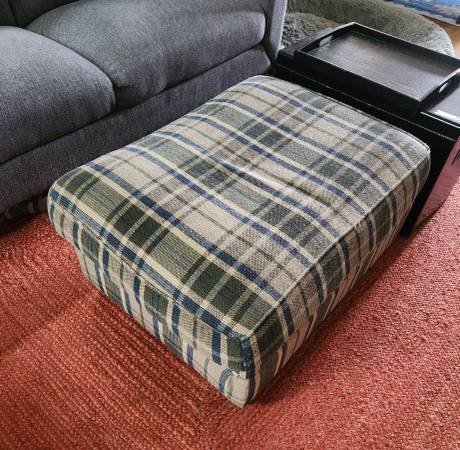 Extremely comfortable chair and ottoman/footstool. Upholstered with solid wood base and frame. There is damage to one arm but it's easily concealed with a cover and doesn't impact the function of the chair. The cover is yours too if you want it. Pictures show chair with burgundy cover, chair without cover, and ottoman/footstool. Free as long as you can come pick it up!