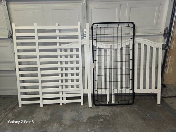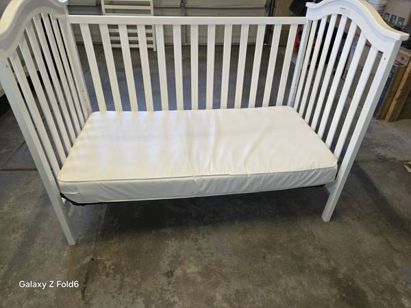 For sale used baby bed convertible white in very good conditions. Mattress included. All sizes screws and nut included. Dimensions: 54"L x 30"W x 42"H. Bottom metal platform high adjustable from floor is 9", or 12", or 15", or 18". Front grill panel can be installed or removed depending age of child.