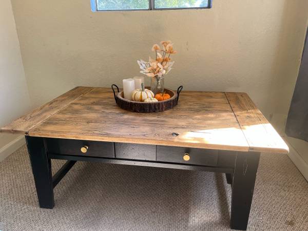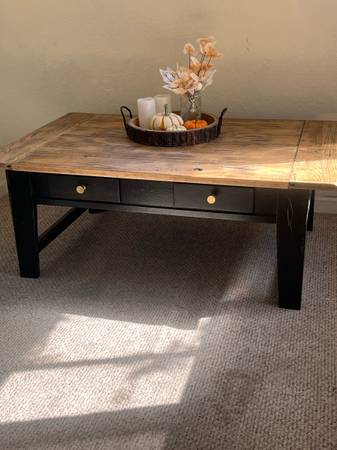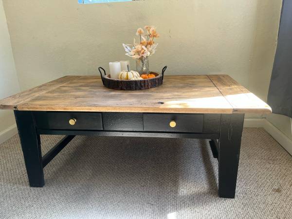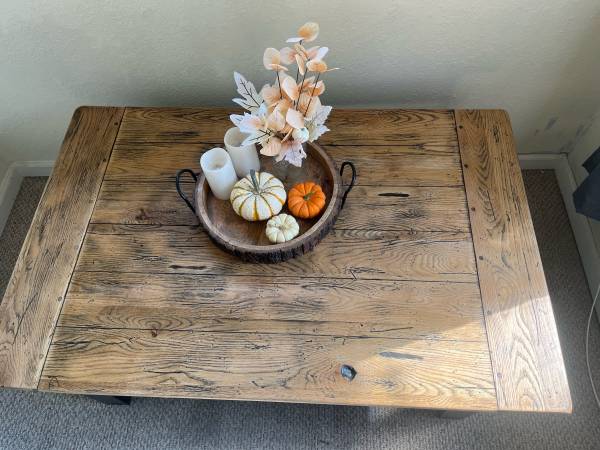 This table was in rough shape when I brought it home. It had three layers of paint coated on top of the wood. It has been stripped and sanded and cleaned and brought back to its original condition. Solid wood table! New paint and new hardware added. They had cut a hole in the table to put their phone cords through, will send a picture to you. I am negotiable on the price! It’s been sealed and brought back to its original condition. Beautiful table for a rustic style vibe. Message for questions or more pics.
