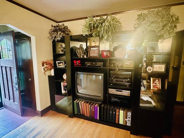 This is a really sharp entertainment center that cost over $2,000 new back in the day of small tv's! Black with some glass, comes in 3 pieces. 2 curio cabinets, one on each end, and the center section. Lots of shelves and space for almost everything. You could probably do some modifications and get a big screen tv in there too. It's 8 feet wide total and just under 7 feet tall.