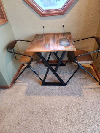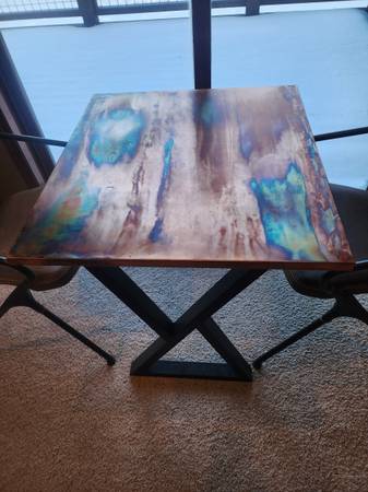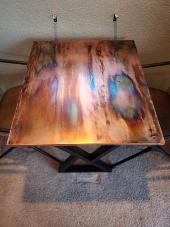 I also made two other similar flame-painted copper tables. Currently planning to keep these two…but, as I mentioned earlier in the ad, make me an offer I can’t refuse and buy the whole set! One is a small, rectangle bar-height “bistro” table that fits nicely in a small breakfast nook (19” Width x 32” Length x 36” Height). The other is a rectangle coffee-table height coffee table (obviously) (24” Width x 48” Length x 18” Height). They also have new, recently purchased Flowyline legs. (See the last four pics.)