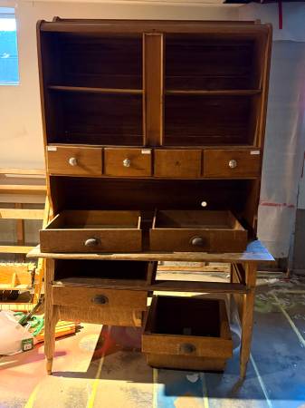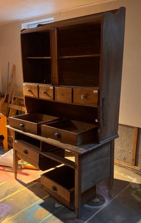 Features drawers, including rare to find possum belly drawers, and a pull out cutting board. There is nice wood work embellishment on the top of the hutch, legs, stable sides, and shelf unit face.
