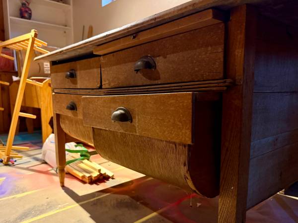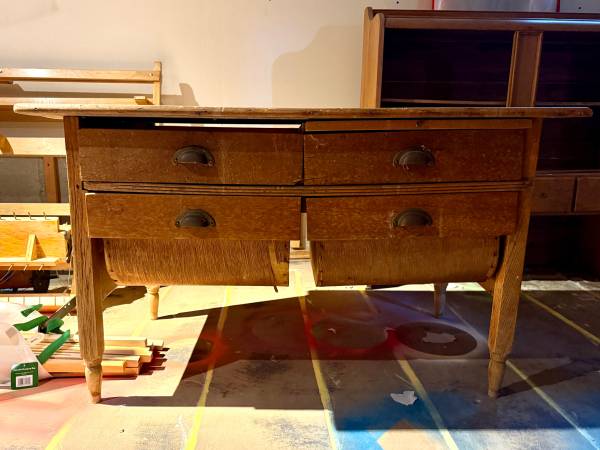 The top half is solid and sturdy. The bottom half is more delicate because it was built with various wood joints (ex. tongue and groove) that have loosened over the years. It is easily fixable with some wiggling, screws, and wood glue. The bottom of a drawer falls out because the sides need to be squared and tightened. The texturing of one of the possum belly drawers has a small tear.