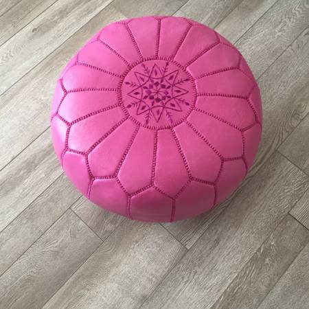 Jonathan Adler Pink Leather Moroccan Pouf Ottoman Foot Stool Condition is like new. Measures approximately 21"diameter x 13"tall Made in Morocco Filled with Kapok (a natural plant fiber) and Dacron...
