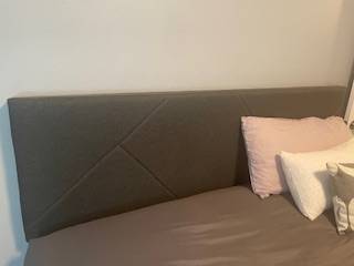 King size, upholstered bedframe with geometric headboard. Dark grey, only used a few times. Wood slats for support - no box spring needed. Mattress not included.
