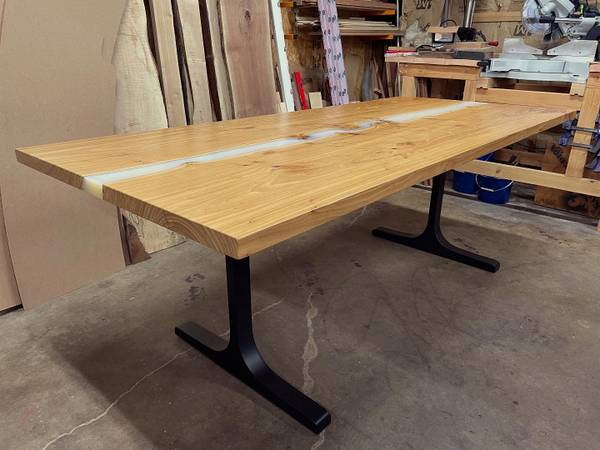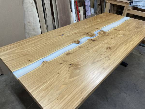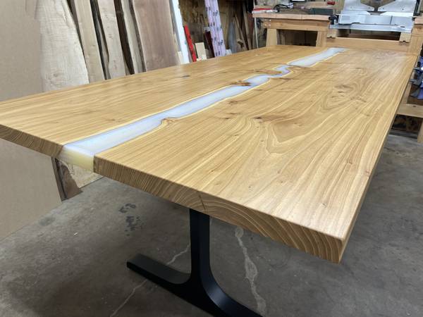Just completed: a stunning 7-foot dining table crafted from a two beautiful matching live edge elm slabs. The piece features mesmerizing grain and figure, with a striking pearlescent resin ‘river’ flowing down the middle, adding unique depth and character. The durable, maintenance-free satin finish ensures lasting beauty with virtually no upkeep.