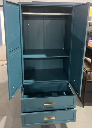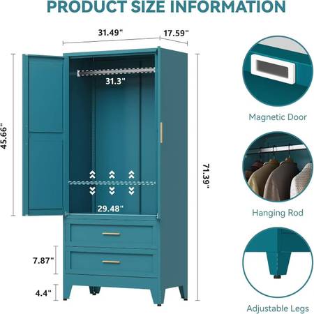 🥨 Metal Wardrobe Cabinet with Hanging Rod, 71" Armoire Wardrobe Closet with 2 Drawers,Farmhouse Metal Clothing Storage Cabinets with Door and Adjustable Shelves for Bedroom,Laundry Room(Blue)