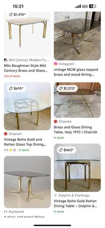 mid-century modern smoked tempered glass dining table brass-toned frame L54”*W42”*H28”(address in ⬇️