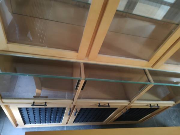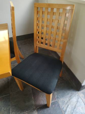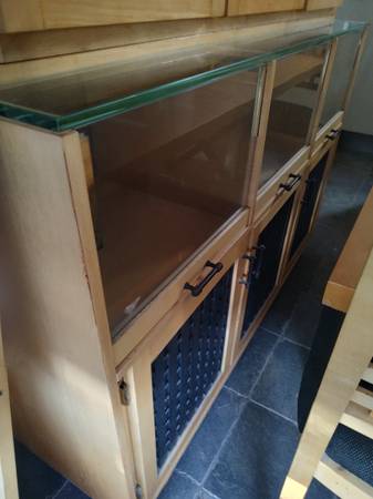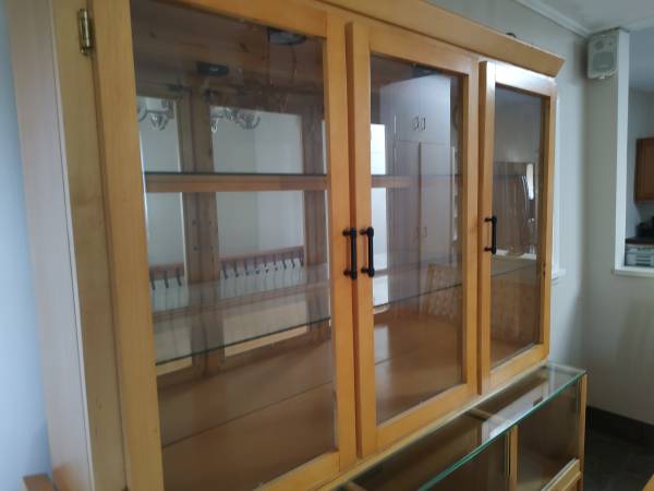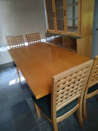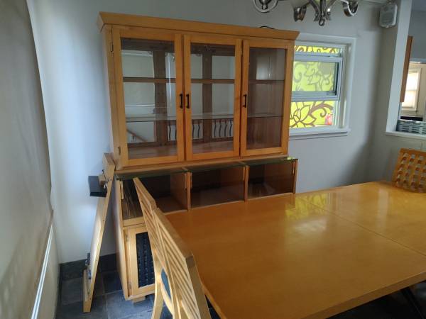 Beautiful mid-century modern (wood hutch) china cabinet with matching table & chairs. Like-new condition. Table includes 4 matching chairs and a 16" leaf. Table dimensions = 80 x 42" Cabinet includes interior lighting; dimensions = 78 x 57 x 18"