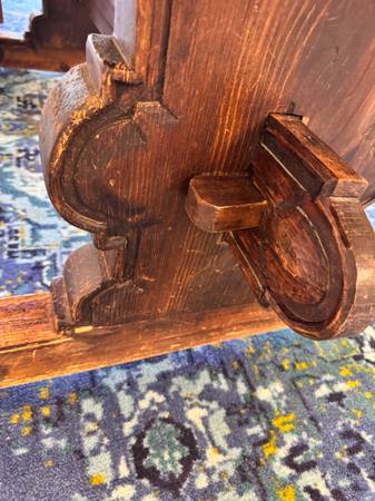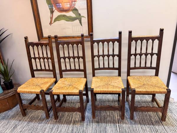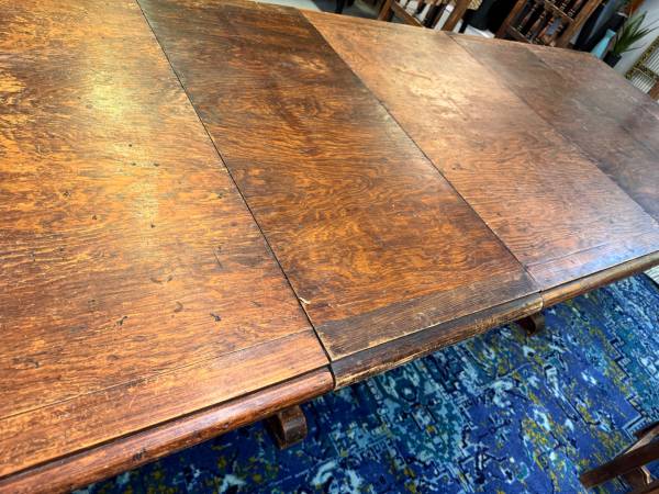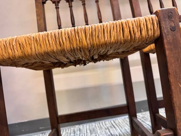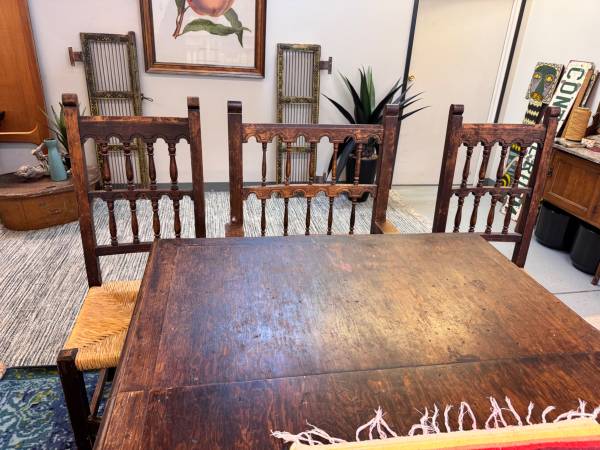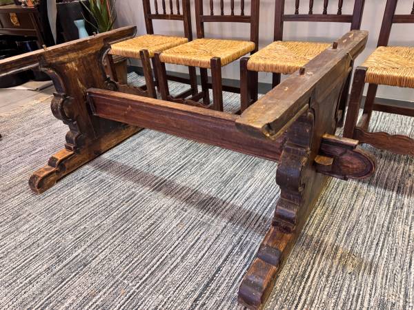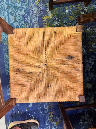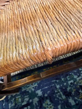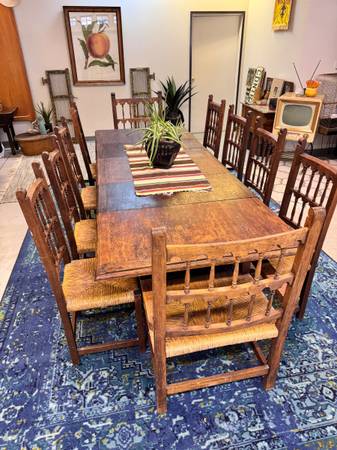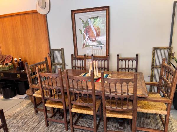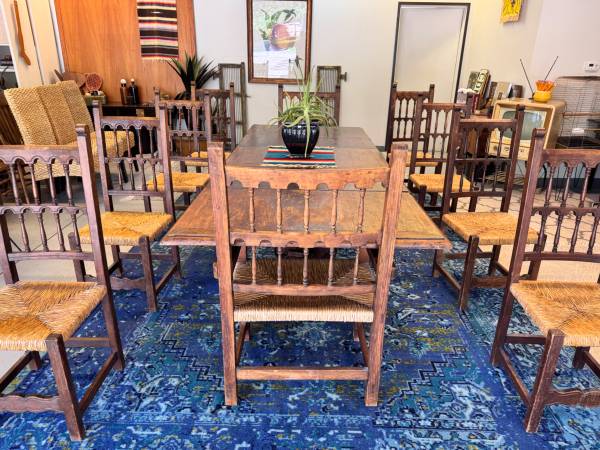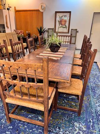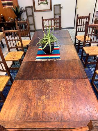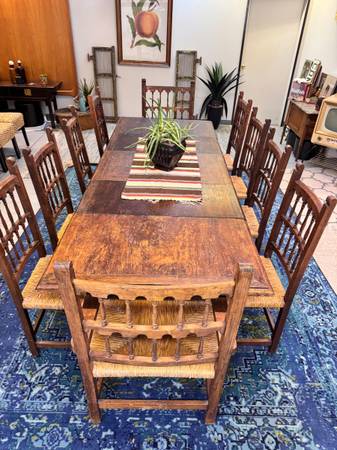 This is such a great group dining table for everyday use, holiday gatherings or grand events. It shows its’ rustic beauty and style with glory, and won’t shy away from wine spills or Cheerios. Just in time for your holiday gatherings this vintage table is solid wood, can be disassembled and can easily downsize from 103 inches to about 58, with 18 inch leaves to fill in as needed. (See pictures for width and chair sizes.) The rush chairs are in overall very good condition and actually quite comfortable for long parties and card games. (One chair has some staining and one with a couple of broken strands, that would be easy to glue back in place or repair - see pictures). There are two captain’s chairs with arms, and two of the other eight are slightly different, as we believe they were originally designed to be “head of the table” before the purchase of the armed ones. Honestly we hate to part with this set but downsized our home, and while we love a good garage studio party… it is time to pass on to a more loved home. $850 cash gets you one solid dining set with many more years to enjoy. Can help break down, (no tools needed) - you’ll need a good sized truck or couple trips, but honestly this has “the look” and style to make any home a favorite for gatherings