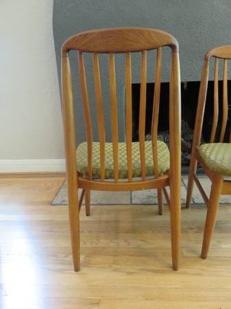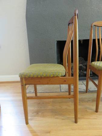 This listing is for a set of 4 identical dining chairs from Benny Linden Design. These dining chairs are mid-century modern style. Each chair is about 37 inches tall (floor to the top of the wood back), 18.5 inches tall (floor to top of the seat cushion), about 18.5 inches wide at the front of the seat, and about 20 inches deep (front of cushion to the chair back). These have been used for many years and are in good condition. There have been a couple spills on the upholstery that are visible. They could use some maintenance – some wood glue, new foot pads, oil, etc. There are various small sections of wear but no major flaws. They have been cleaned but could use a detailed cleaning to your own standards.