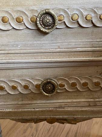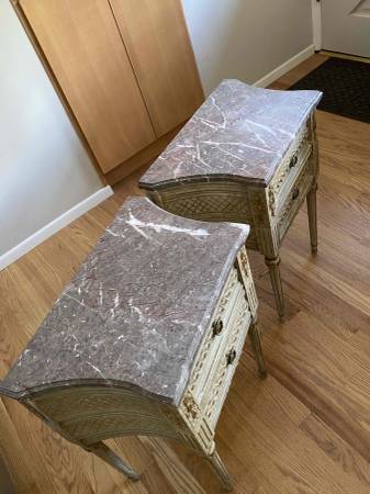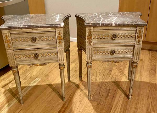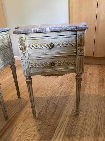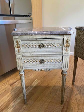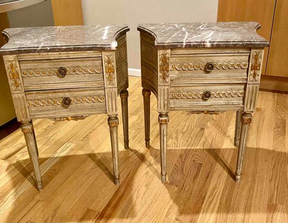 Set of 2 stunning French-Style solid wood end tables or nightstands with cream bases and gray veined marble tops. Have gorgeous carved details, 2 drawers, decorative knobs and beautiful muted gold details. Look online at Chairish.com, 1st Dibs and other websites-selling for much more - hard to find anything like these-unique and heirloom quality!